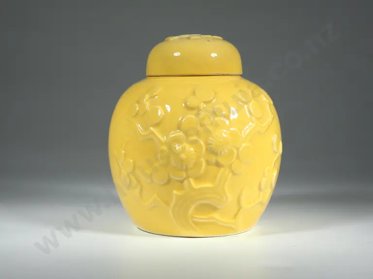 Crown Lynn Yellow Ginger Jar w Moulded Apple Blossom Decoration Estimate: $100 - $200