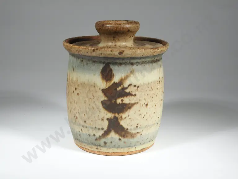 Bisque Glazed Lidded Pickle Canister - Beige Ground w Speckled Brown & Pale Blue Overlay & Asian Character on Side. Estimate: $30 - $50