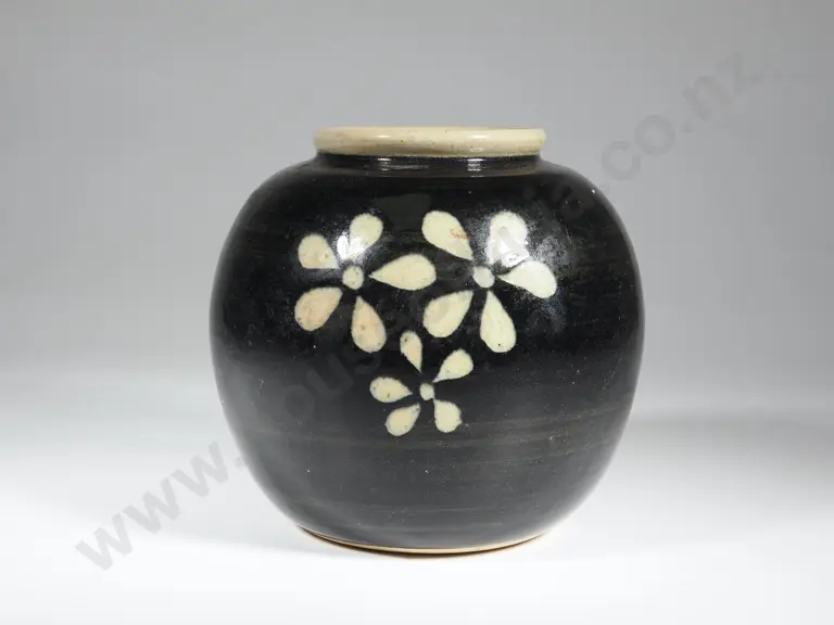 Bulbous Pottery Vase w Black Ground & Stylized Daisy Pattern. Marked With An S In A Circle. Estimate: $30 - $50