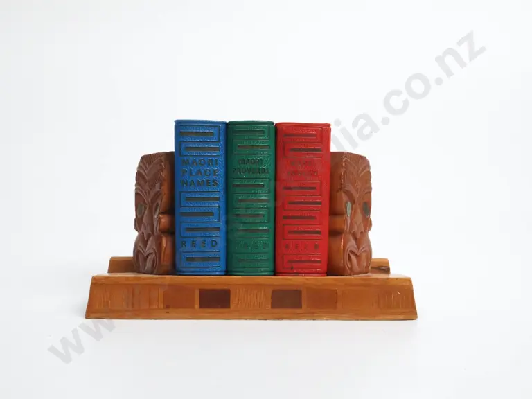 Three Lilliput Maori Books With IInlaid NZ Timber Marquetry Stand w Carved Tiki Supports ; Sovereign Woodware Ltd Estimate: $80 - $120