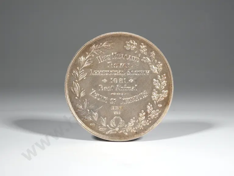 Large Sterling Silver NZ Royal Agricultural Society Medal for Best Animal 'Kelite Of Lindertis' 1961 Estimate: $200 - $400