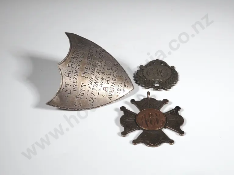 Two Prize Fobs & Prize Shield to A Hill - St Albans Cricket Club - All in Sterling Silver Estimate: $100 - $200