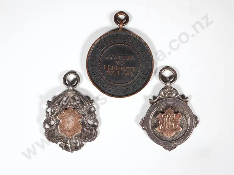 Two Sterling Silver Fobs Both with Gold Cartouche & A Bronze Life Saving Medal To I Lissette 27/01/54 Estimate: $40 - $80