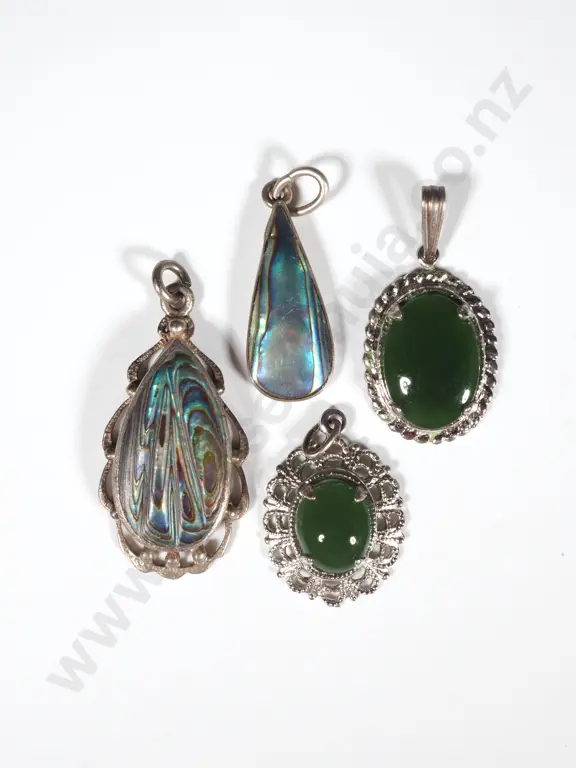 Two Paua Shell & Sterling Silver Pendants & Two Greenstone Pendants Estimate: $50 - $100