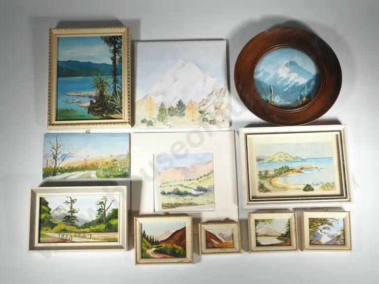 Nine Miniature New Zealand Scenes, Circular Watercolour Of Fiordland & A Tile Of Mount Cook Estimate: $40 - $80