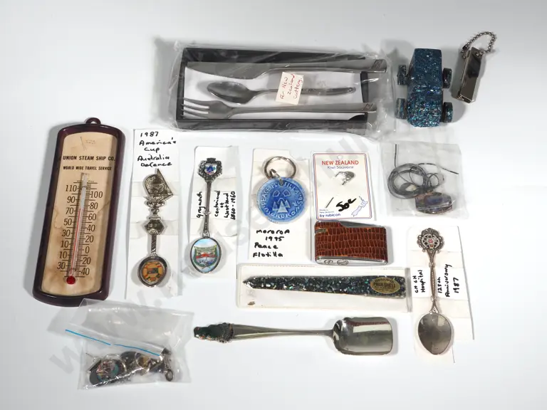 Selection Of NZ Interest Spoons, Paua Shell Jewellery , Paua Shell Truck, Mororoa Peace Flotilla Keyring Estimate: $40 - $80