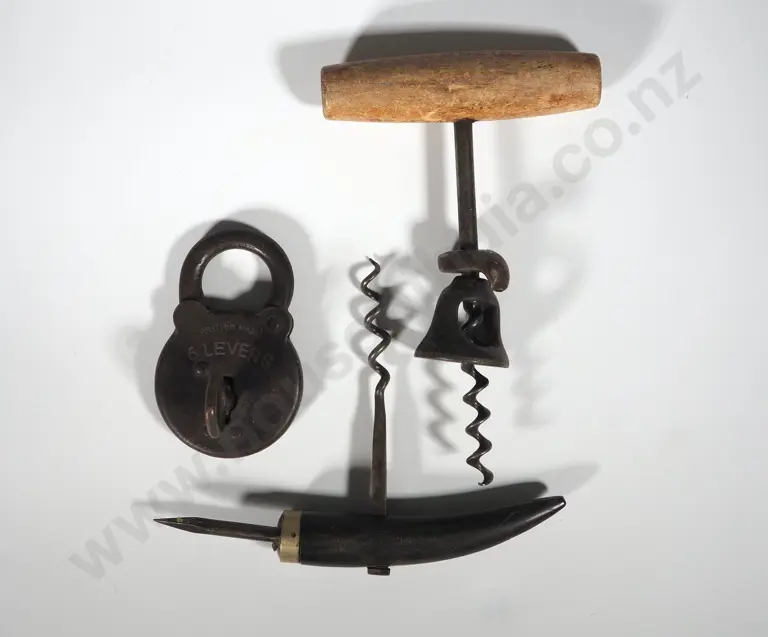 Two Antique Cork Screws & Six Lever Padlock With Original Key Estimate: $50 - $100