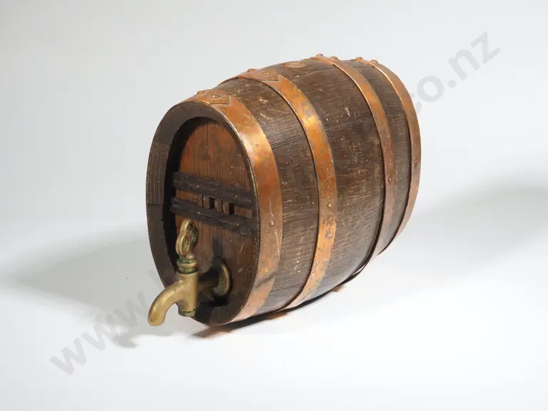 Oak Whiskey Barrel w Brass Tap & Copper Binding Estimate: $50 - $100