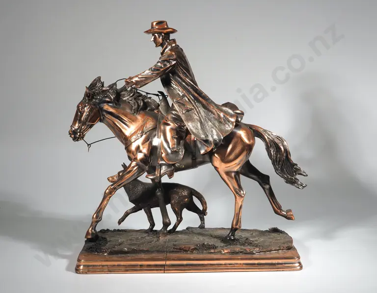 Copper/Resin Sculpture of Cowboy w Horse & Dog. A/F Estimate: $30 - $80