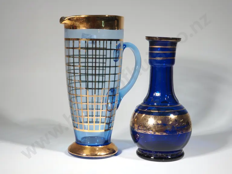 Blue & Gilt Decanter, Mid Century Blue & Gold Jug & Cut Crystal Vase Estimate: $100 - $200