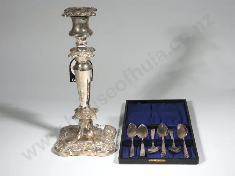 Silver Plated Candlestick & Set Of Six Boxed Teaspoons Estimate: $20 - $40