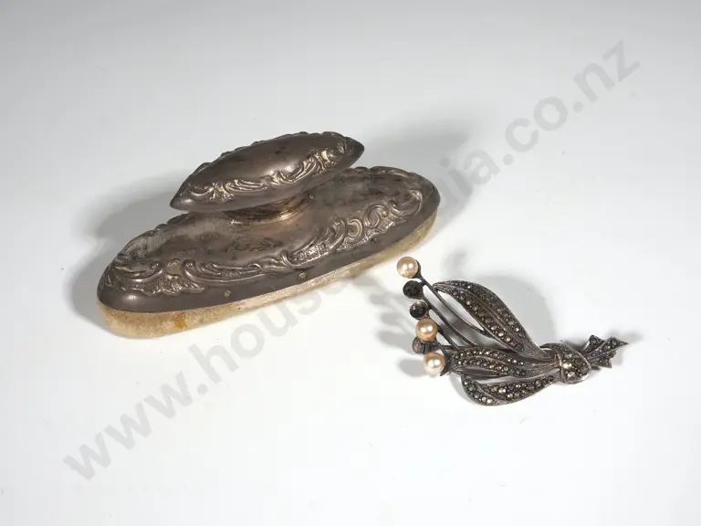 Large Sterling Silver Embossed Nail Buffer & a Marcasite & Pearl Brooch (Two Pearls Missing) Estimate: $50 - $100