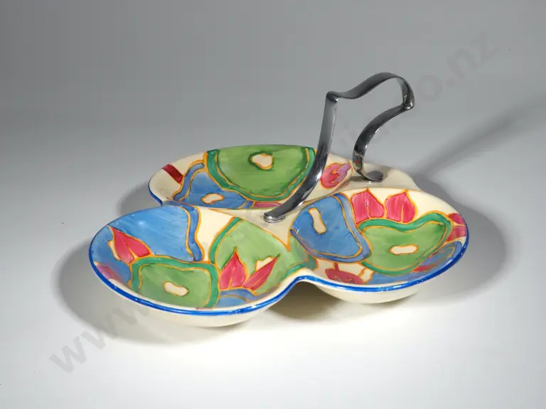 Clarice Cliff Bizarre Fantasque Blue Chintz Three Section Hors D'Oeuvres Tray Estimate: $100 - $200
