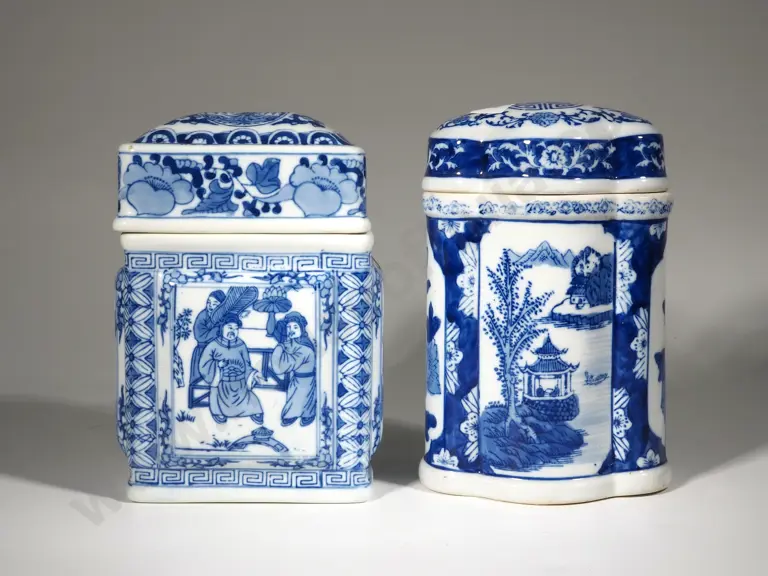 Two Large Blue & White Lidded Cannisters. One of Rectangular & the Other Quatrefoil Shaped. Estimate: $80 - $120