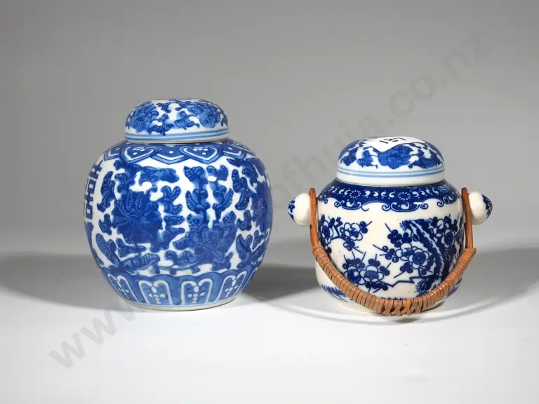 Blue & White Ginger Jar & A Ceramic Jar With Rattan Handles ( Missing Handle) Estimate: $50 - $80