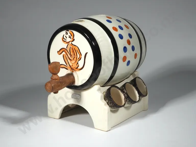 German China Barrel w Six China Shot Cup. Cream Ground With Brown Orange & Blue Accents Estimate: $40 - $80