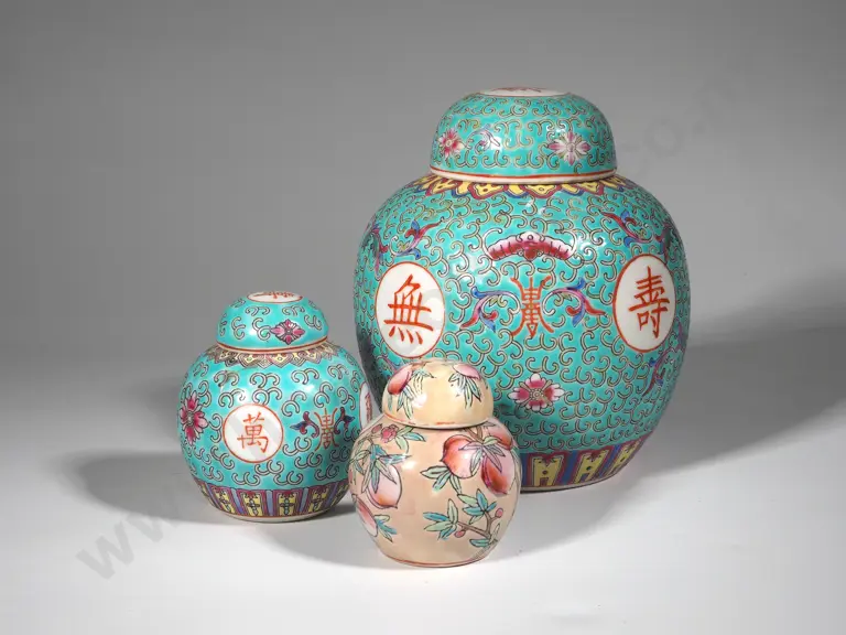 Three Oriental Ginger Jars - Two Famille Vert & One with Allover Stylised Peaches Estimate: $60 - $80