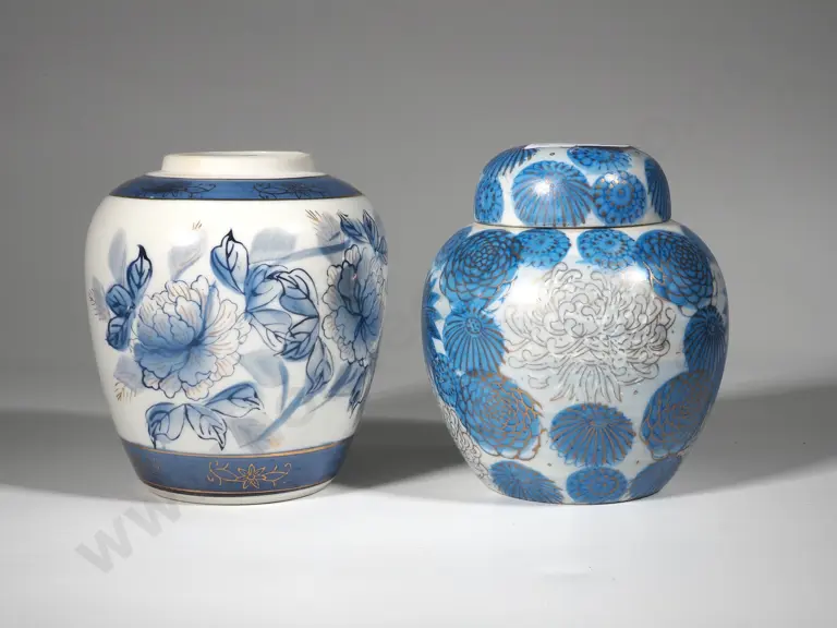 Japanese Blue, White & Gold Ginger Jar with Chrysanthemum Decoration & Oriental Ginger Jar Missing Lid Estimate: $50 - $100