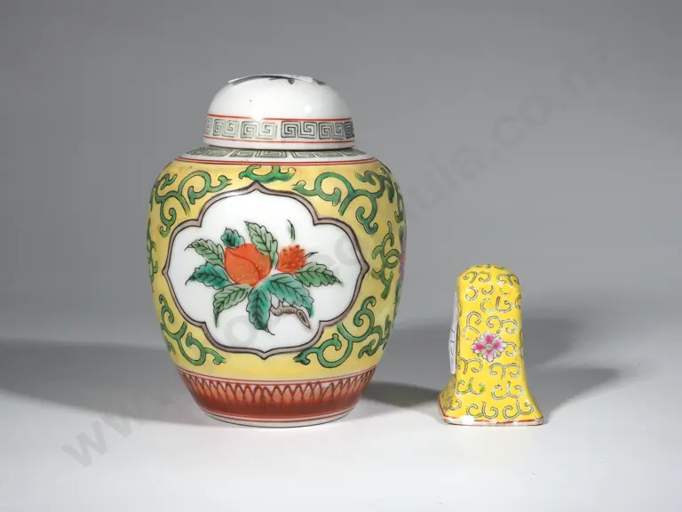 Vintage Mun Shou Famille Vert Large & Small Ginger Jar & a Yellow Ground Salt (a/f) Estimate: $30 - $50