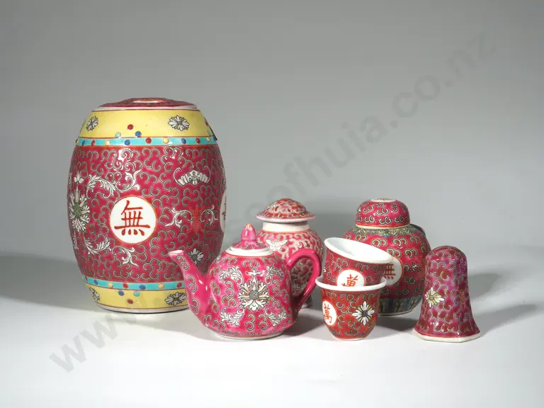 Vintage Mun Shou Famille Rose Barrel with Lid (a/f), Small Ginger Jar, Teapot & Tea Cups Estimate: $40 - $80