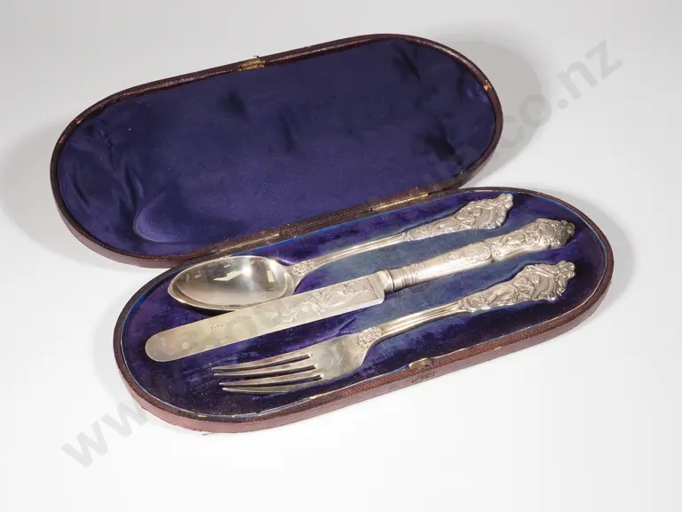 Sterling Silver Highly Embossed Christening Set With in A Personalised Leather Case Estimate: $200 - $400