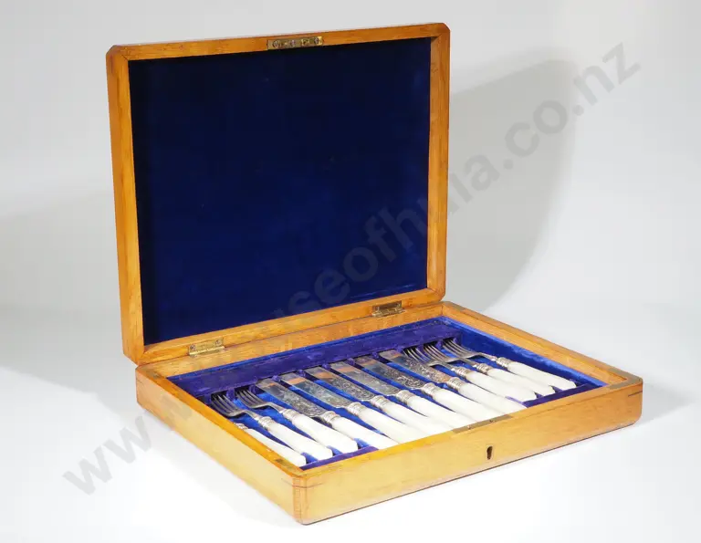 Sterling Silver Six Place Fruit Knife & Fork Set In Oak Box With Carved Mother Of Pearl Handle & Engraved Blades Estimate: $400 - $600