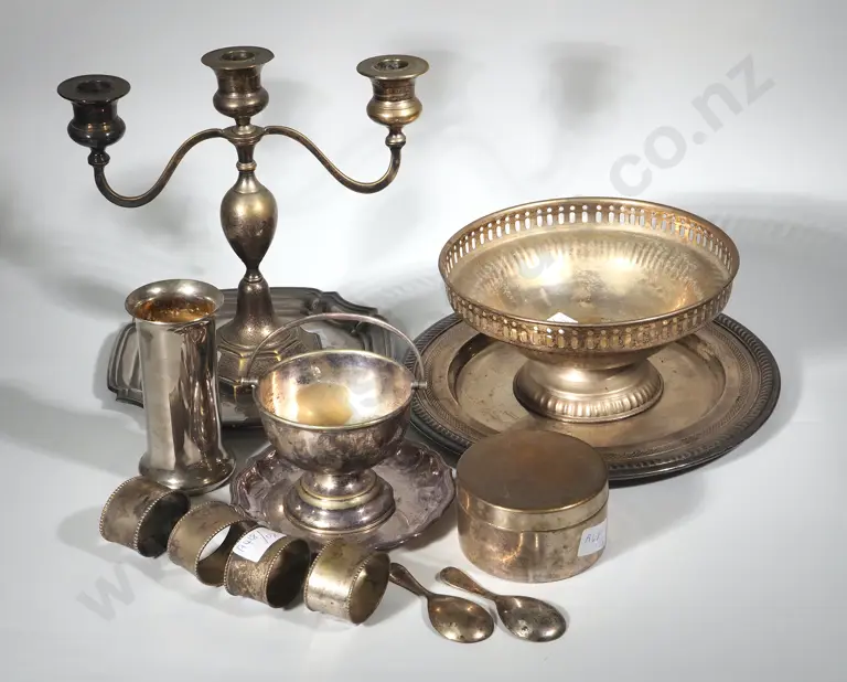 Collection Of Silver Plated Cutlery including Salvers, Napkin Ring, Candelabra, Vase, Sugar Bowl & Cannister Estimate: $40 - $60