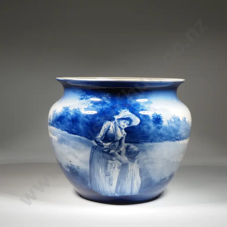 Antique Royal Doulton Blue Children’s Ware Jardiniere Depicting A Child Rummaging Through Her Mother's Basket
