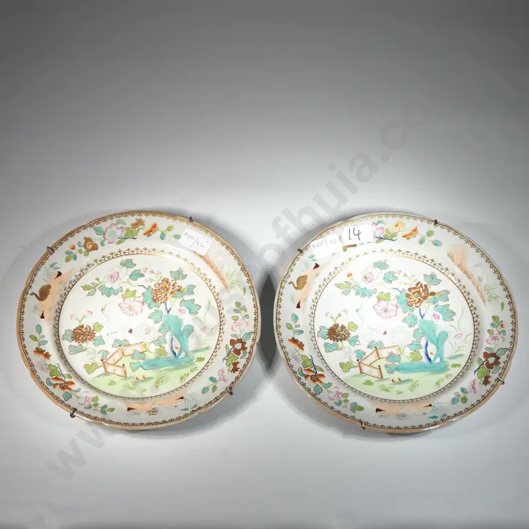 Pair Of Antique Davenport Stone China Plates Featuring A Chinoiserie Pattern with Stork & Floral Motifs (A/F)