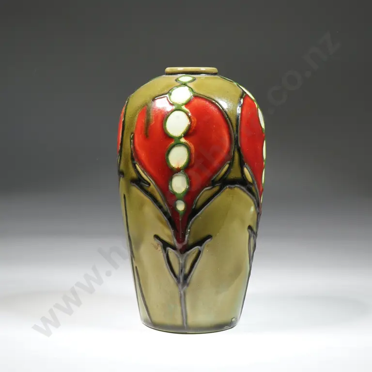 Minton Secessionist No.16 Vase Green - Red & White Glazes To The Ground w Green Tube Lining