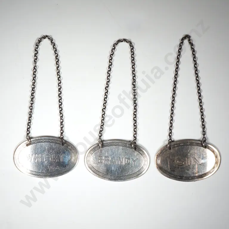 Three Sterling Silver Oval Decanter Labels For Gin - Whisky & Brandy