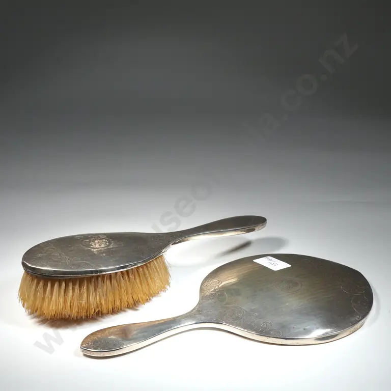 Sterling Silver Dressing Table Mirror & Hair Brush With Engine Turned & Scroll Decoration