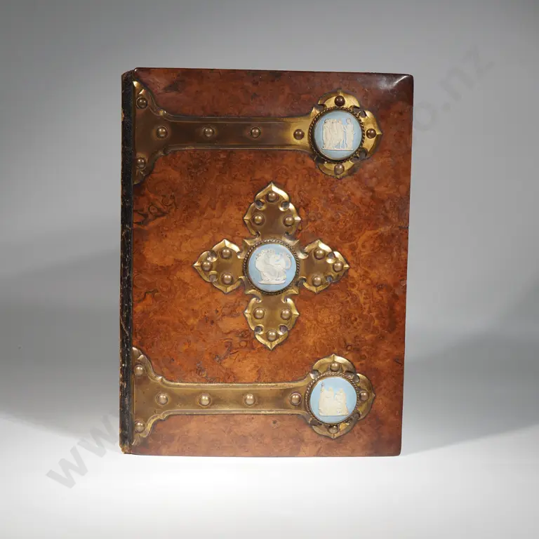 Mid Victorian Burr Walnut Stationery Folder In Gothic Style w Blue Jasperware Roundels & Blue Watered Silk Inside