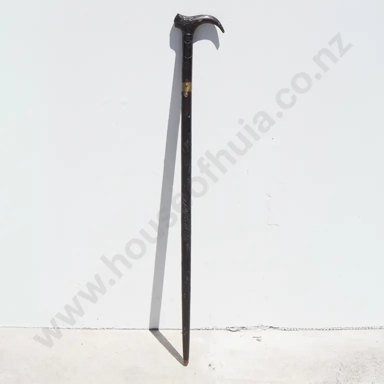 Carved Wooden Sword Stick Of Unknown Origin w Brass Mounts