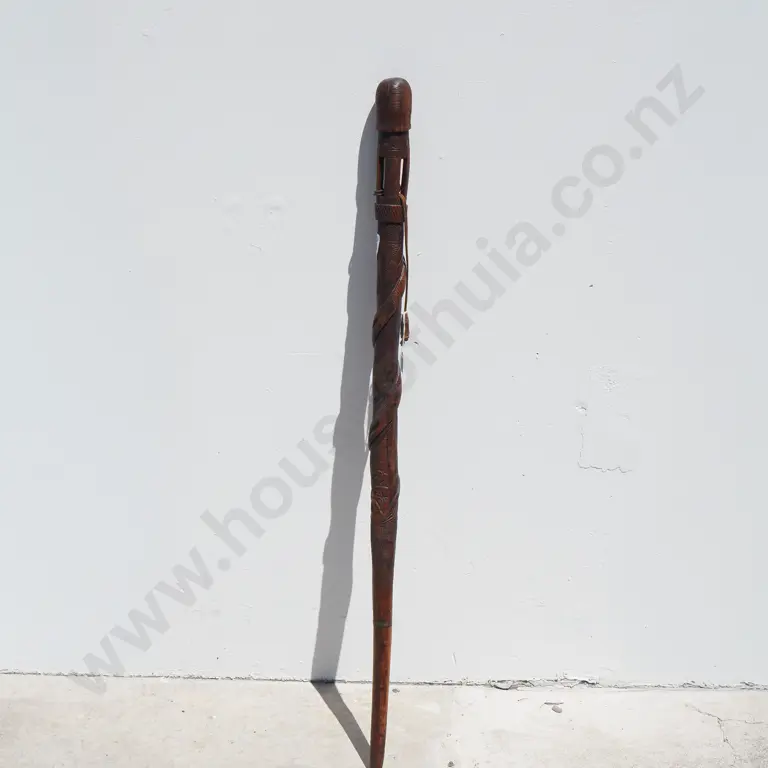 Wooden Walking Stick w Detailed Carvings - Snake Motif w Brass Trim & Wooden Toggle & String