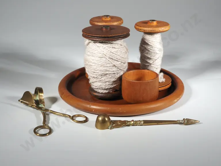 Wooden Items Including Three Bobbins, Tray, Brass Candle Snuffer Etc Estimate: $20 - $40