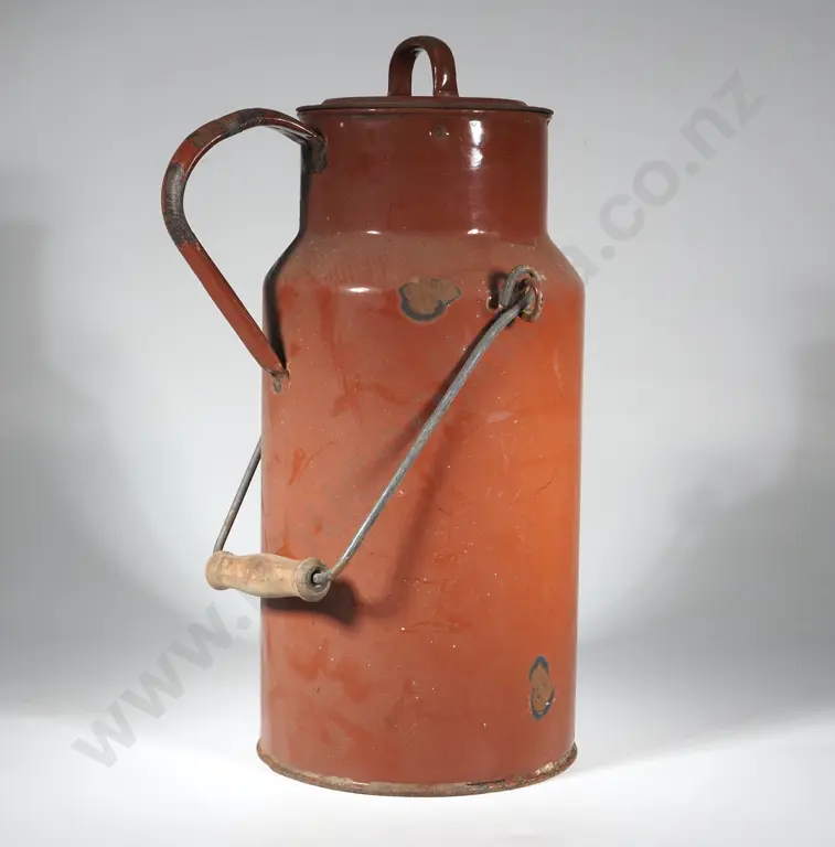 Vintage Brown Enamel Milk Can with Wooden Handle Estimate: $40 - $80
