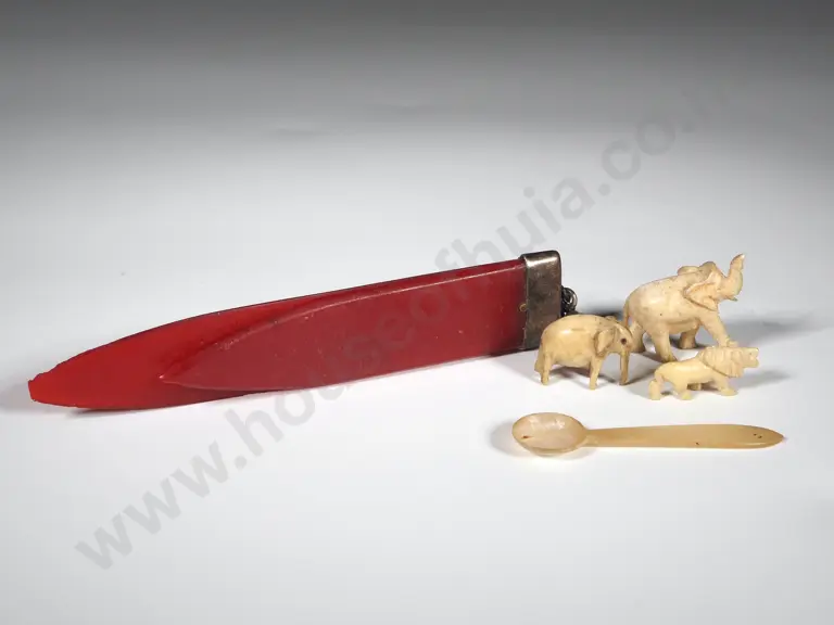 Red Bakelite & Sterling Silver Bookmark, Three Miniature Ivory Animals, & a MOP Salt Spoon Estimate: $40 - $80