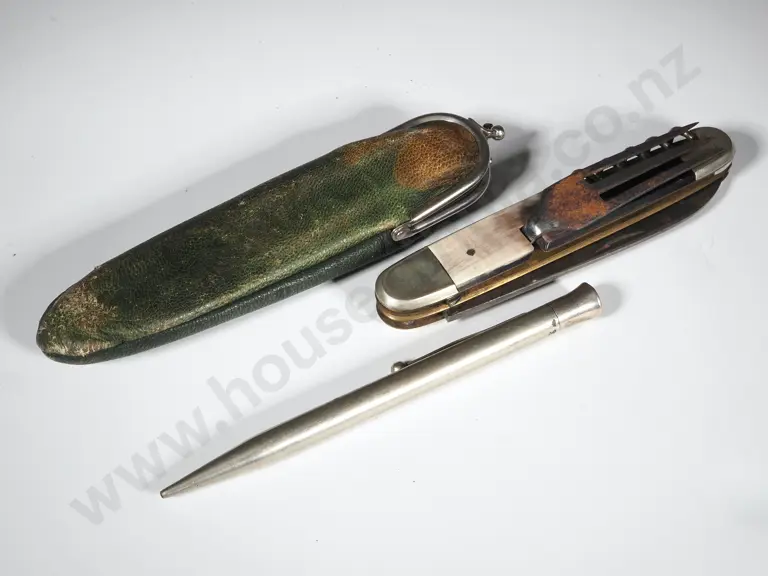 A Pocket Knife, A Silver Sheaffers Pencil, & a Slim Green Leather Purse.
