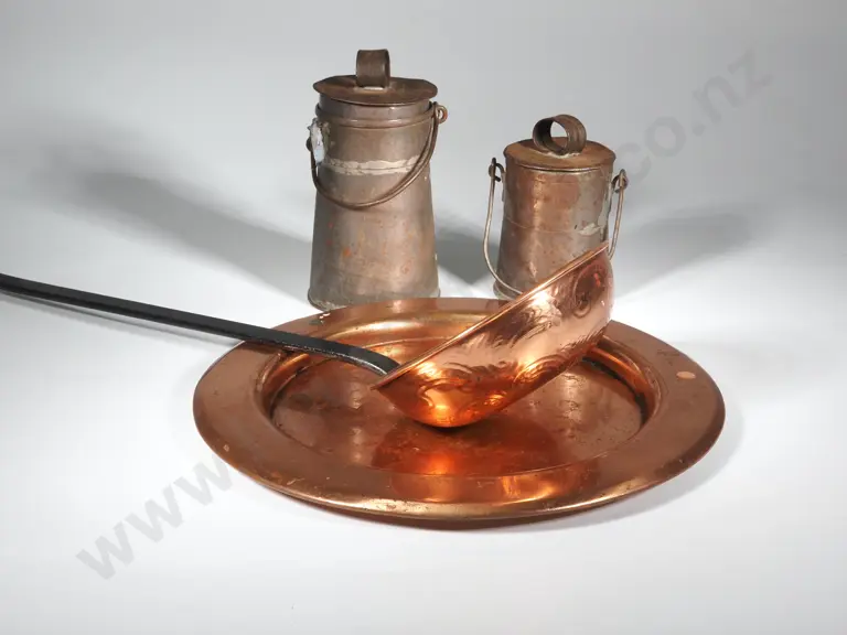 Copper Tray, Ornamental Copper Ladle & Two Lidded Tin Containers With Covers & Bail Handles Estimate: $40 - $80