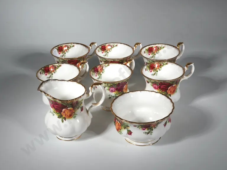 Six Royal Albert Old Country Roses Coffee Cups, Milk Jug & Sugar Bowl.