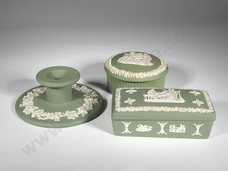 Two Green Jasperware Trinket Boxes;One Rectangular & The Other Circular & A Candlestick Estimate: $40 - $80