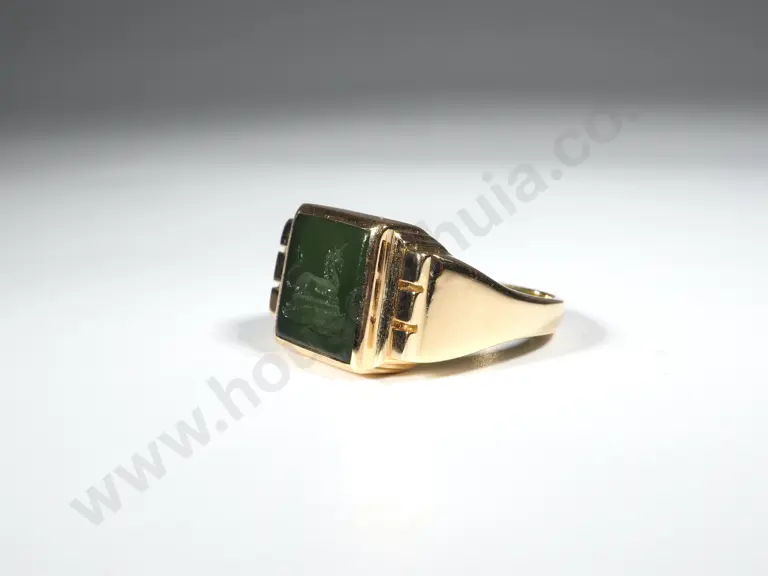 Substantial 18ct Gold Tank Style Seal Signet Ring w Green Carved Stone Estimate: $1,400 - $2,000