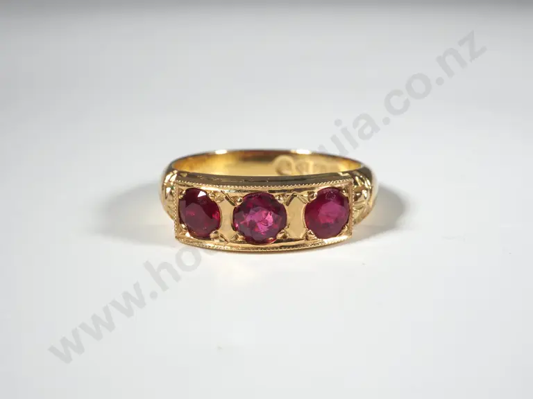 Exceptional 18ct Gold Three Ruby Ring w Crisp English Hallmarks Estimate: $800 - $1,200