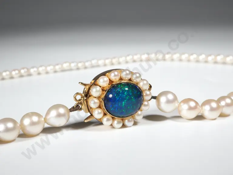 18ct Gold Graduated Pearl Necklace w Cabochon Opal Clasp Estimate: $200 - $400