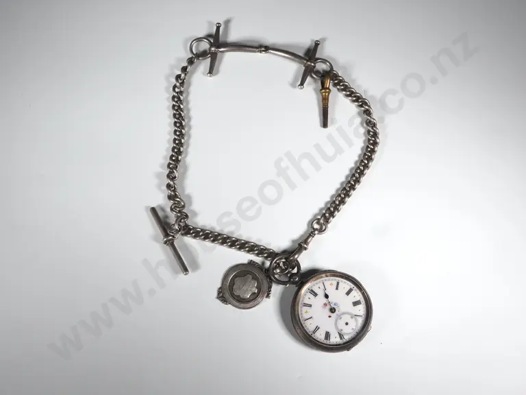 Sterling Silver Fob Chain w Pendant Medallion & Half Hunter w Painted Enamel Porcelain Dial Estimate: $200 - $300