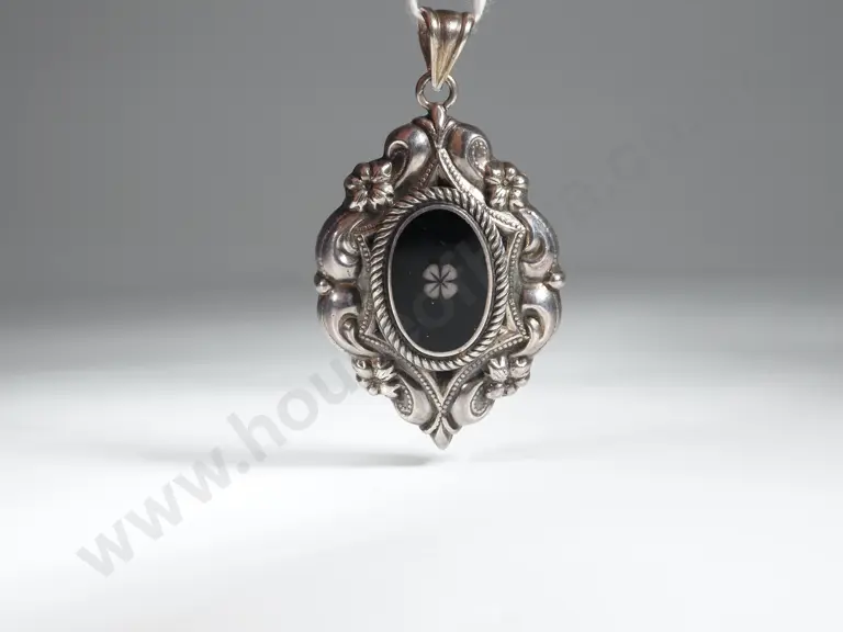 Vintage Sterling Silver Black Enamel Pendant w Ornate Scrolling Estimate: $40 - $80