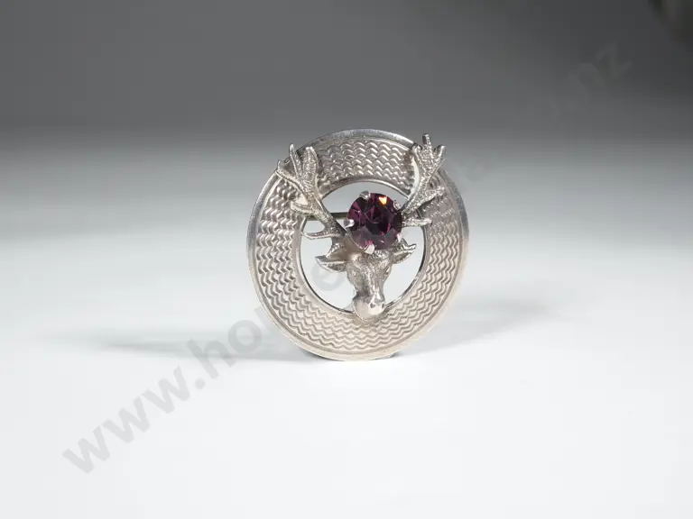 Sterling Silver Scottish Stag Head Brooch Set w Amethyst Estimate: $40 - $80