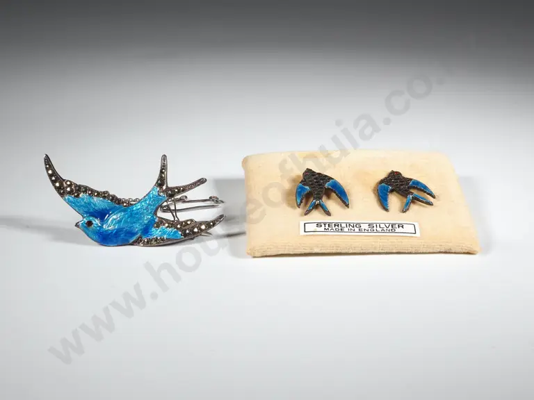 Vintage Sterling Silver Marcasite & Enamel Bluebird Of Happiness Brooch & Earrings Estimate: $50 - $100