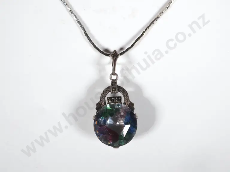 Vintage Multi Coloured Tourmaline Set in Sterling Silver & Marcasite Surround w Chain Estimate: $50 - $100